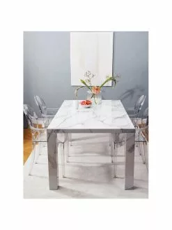 Der Tisch kann um 45 cm verlängert werden, indem man die beiden Hälften auseinander zieht und die Verlängerungsplatte aus der Tischmitte klappt.